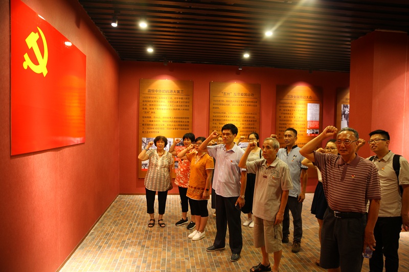 随后,全体党员驱车前往林伟民与中国早期工人运动史迹陈列馆,瞻仰中国工人运动著名领袖林伟明的铜像,了解林伟民发动和领导工人运动的事迹,学习其伟大的革命精神和崇高追求。在陈列馆大厅,所有同志面对党旗肃立,举起右拳,在陈弢主任的领誓下,重温入党誓词。